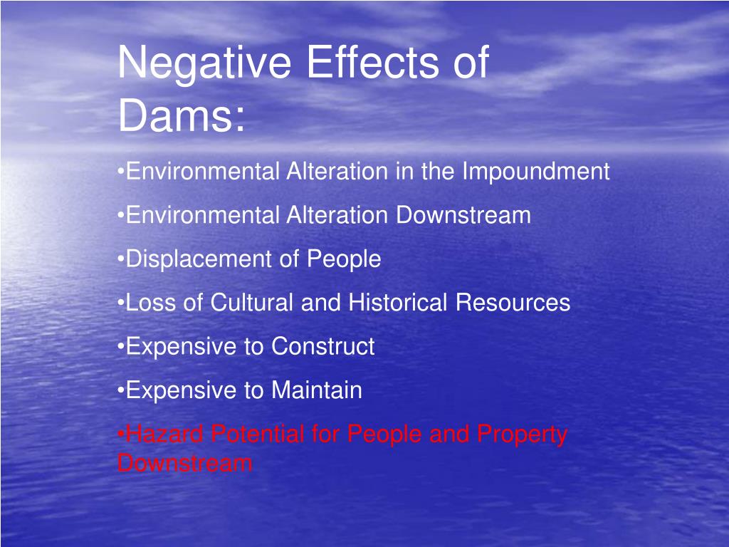 Negative Effects of Dams: • Environmental Alteration in the Impoundment • Environmental Alteration Downstream • Displacement of People • Loss of Cultural and Historical Resources • Expensive to Construct • Expensive to Maintain • Hazard Potential for People and Property Downstream