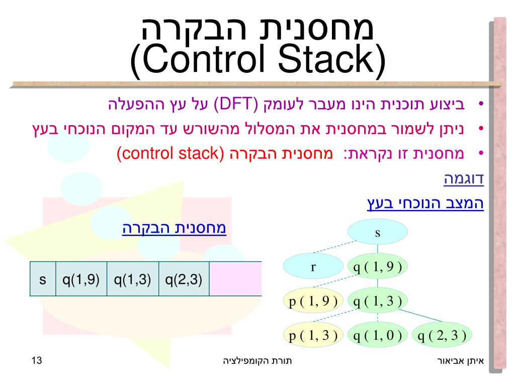 s r q ( 1, 9 ) p ( 1, 9 ) q ( 1, 3 ) p ( 1, 3 ) q ( 1, 0 ) q ( 2, 3 ) מחסנית הבקרה(Control Stack) • ביצוע תוכנית הינו מעבר לעומק (DFT) על עץ ההפעלה • ניתן לשמור במחסנית את המסלול מהשורש עד המקום הנוכחי בעץ • מחסנית זו נקראת: מחסנית הבקרה (control stack) דוגמה המצב הנוכחי בעץ מחסנית הבקרה תורת הקומפילציה