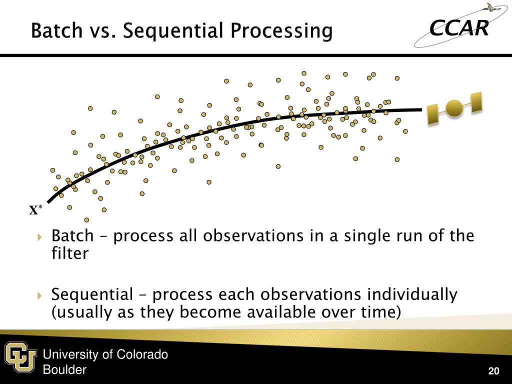 Batch vs. Sequential Processing • Batch – process all observations in a single run of the filter • Sequential – process each observations individually (usually as they become available over time) X*