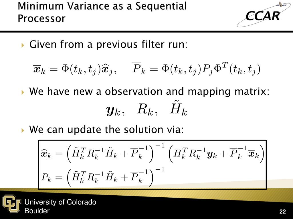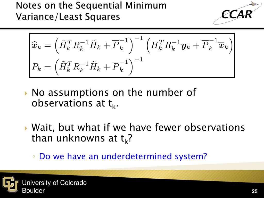 Notes on the Sequential Minimum Variance/Least Squares • No assumptions on the number of observations at tk. • Wait, but what if we have fewer observations than unknowns at tk? • Do we have an underdetermined system?