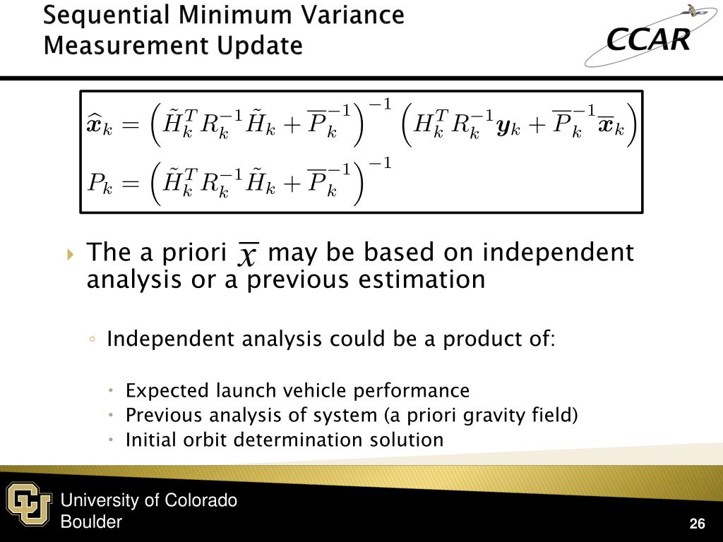 Sequential Minimum Variance Measurement Update • The a priori may be based on independent analysis or a previous estimation • Independent analysis could be a product of: • Expected launch vehicle performance • Previous analysis of system (a priori gravity field) • Initial orbit determination solution