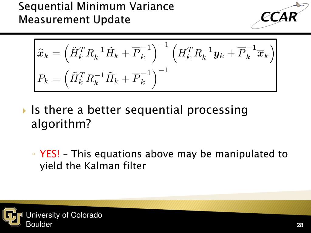Sequential Minimum Variance Measurement Update • Is there a better sequential processing algorithm? • YES! – This equations above may be manipulated to yield the Kalman filter