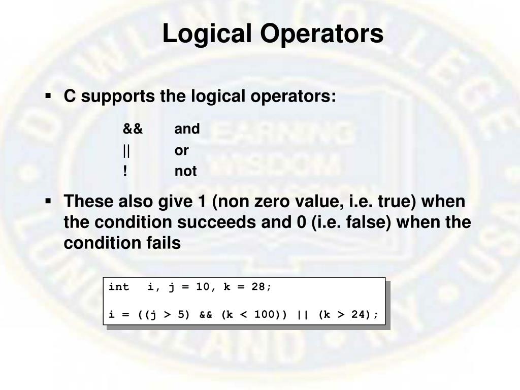 Logical Operators • C supports the logical operators: && and || or ! not • These also give 1 (non zero value, i.e. true) when the condition succeeds and 0 (i.e. false) when the condition fails int i, j = 10, k = 28; i = ((j > 5) && (k < 100)) || (k > 24);