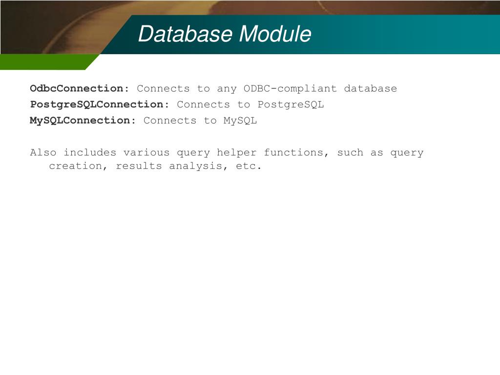 Database Module OdbcConnection: Connects to any ODBC-compliant database PostgreSQLConnection: Connects to PostgreSQL MySQLConnection: Connects to MySQL Also includes various query helper functions, such as query creation, results analysis, etc.