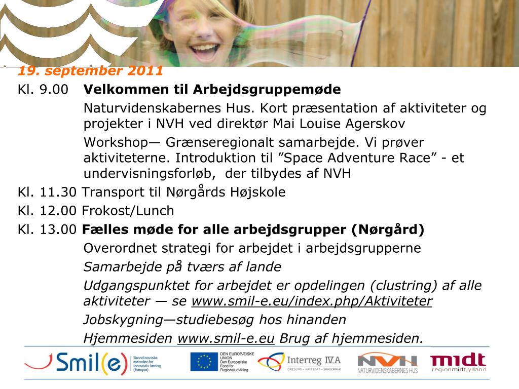 19. september 2011 Kl. 9.00 Velkommen til Arbejdsgruppemøde Naturvidenskabernes Hus. Kort præsentation af aktiviteter og projekter i NVH ved direktør Mai Louise Agerskov Workshop— Grænseregionalt samarbejde. Vi prøver aktiviteterne. Introduktion til ”Space Adventure Race” - et undervisningsforløb, der tilbydes af NVH Kl. 11.30 Transport til Nørgårds Højskole Kl. 12.00 Frokost/Lunch Kl. 13.00 Fælles møde for alle arbejdsgrupper (Nørgård) Overordnet strategi for arbejdet i arbejdsgrupperne Samarbejde på tværs af lande Udgangspunktet for arbejdet er opdelingen (clustring) af alle aktiviteter — se www.smil-e.eu/index.php/Aktiviteter Jobskygning—studiebesøg hos hinanden Hjemmesiden www.smil-e.eu Brug af hjemmesiden.