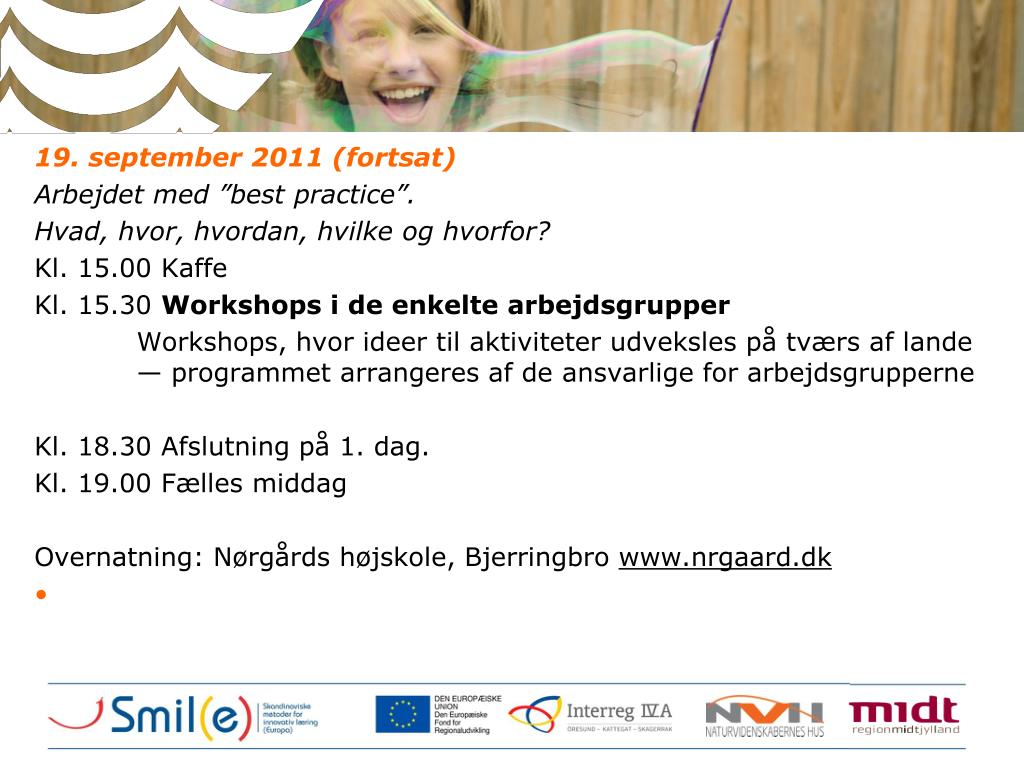 19. september 2011 (fortsat) Arbejdet med ”bestpractice”. Hvad, hvor, hvordan, hvilke og hvorfor? Kl. 15.00 Kaffe Kl. 15.30 Workshops i de enkelte arbejdsgrupper Workshops, hvor ideer til aktiviteter udveksles på tværs af lande — programmet arrangeres af de ansvarlige for arbejdsgrupperne Kl. 18.30 Afslutning på 1. dag. Kl. 19.00 Fælles middag Overnatning: Nørgårds højskole, Bjerringbro www.nrgaard.dk