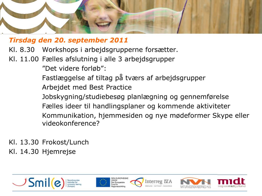 Tirsdag den 20. september 2011 Kl. 8.30 Workshops i arbejdsgrupperne forsætter. Kl. 11.00 Fælles afslutning i alle 3 arbejdsgrupper ”Det videre forløb”: Fastlæggelse af tiltag på tværs af arbejdsgrupper Arbejdet med Best Practice Jobskygning/studiebesøg planlægning og gennemførelse Fælles ideer til handlingsplaner og kommende aktiviteter Kommunikation, hjemmesiden og nye mødeformer Skype eller videokonference? Kl. 13.30 Frokost/Lunch Kl. 14.30 Hjemrejse