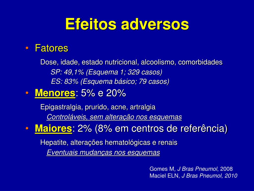 Efeitos adversos • Fatores Dose, idade, estado nutricional, alcoolismo, comorbidades SP: 49,1% (Esquema 1; 329 casos) ES: 83% (Esquema básico; 79 casos) • Menores: 5% e 20% Epigastralgia, prurido, acne, artralgia Controláveis, sem alteração nos esquemas • Maiores: 2% (8% em centros de referência) Hepatite, alterações hematológicas e renais Eventuais mudanças nos esquemas Gomes M, J Bras Pneumol, 2008 Maciel ELN, J Bras Pneumol, 2010