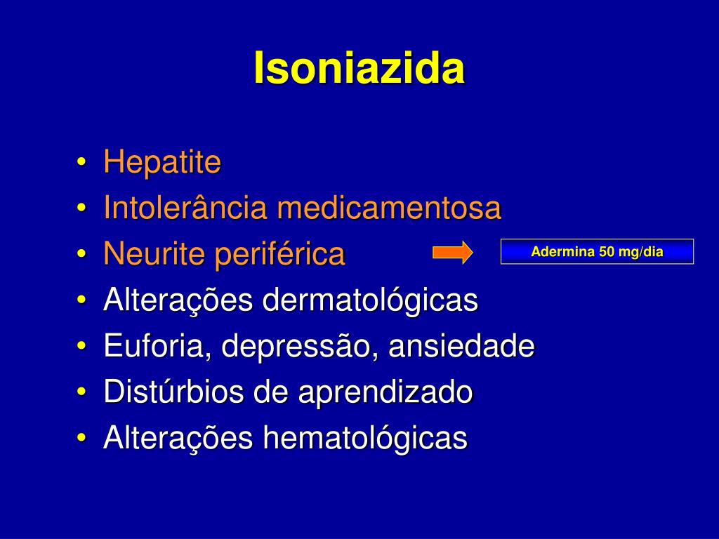 Isoniazida • Hepatite • Intolerância medicamentosa • Neurite periférica • Alterações dermatológicas • Euforia, depressão, ansiedade • Distúrbios de aprendizado • Alterações hematológicas Adermina 50 mg/dia