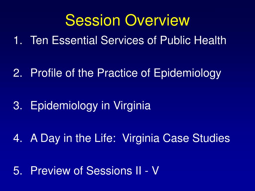 Session Overview • Ten Essential Services of Public Health • Profile of the Practice of Epidemiology • Epidemiology in Virginia • A Day in the Life: Virginia Case Studies • Preview of Sessions II - V
