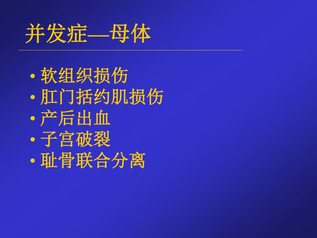 并发症—母体 • 软组织损伤 • 肛门括约肌损伤 • 产后出血 • 子宫破裂 • 耻骨联合分离