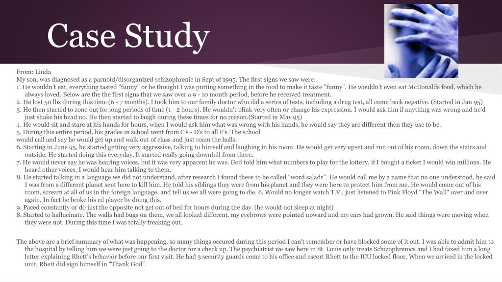 Case Study From: Linda My son, was diagnosed as a parnoid/disorganized schizophrenic in Sept of 1995. The first signs we saw were: 1. He wouldn't eat, everything tasted "funny" or he thought I was putting something in the food to make it taste "funny". He wouldn't even eat McDonalds food, which he always loved. Below are the the first signs that we saw over a 9 - 10 month period, before he received treatment. 2. He lost 50 lbs during this time (6 - 7 months). I took him to our family doctor who did a series of tests, including a drug test, all came back negative. (Started in Jan 95) 3. He then started to zone out for long periods of time (1 - 2 hours). He wouldn't blink very often or change his expression. I would ask him if anything was wrong and he'd just shake his head no. He then started to laugh during these times for no reason.(Started in May 95) 4. He would sit and stare at his hands for hours, when I would ask him what was wrong with his hands, he would say they are different then they use to be. 5. During this entire period, his grades in school went from C's - D's to all F's. The school would call and say he would get up and walk out of class and just roam the halls. 6. Starting in June 95, he started getting very aggressive, talking to himself and laughing in his room. He would get very upset and run out of his room, down the stairs and outside. He started doing this everyday. It started really going downhill from there. 7. He would never say he was hearing voices, but it was very apparent he was. God told him what numbers to play for the lottery, if I bought a ticket I would win millions. He heard other voices, I would hear him talking to them. 8. He started talking in a language we did not understand, after research I found these to be called "word salads". He would call me by a name that no one understood, he said I was from a different planet sent here to kill him. He told his siblings they were from his planet and they were here to protect him from me. He would come out of his room, scream at all of us in the foreign language, and tell us we all were going to die. 6. Would no longer watch T.V., just listened to Pink Floyd "The Wall" over and over again. In fact he broke his cd player by doing this. 9. Paced constantly or do just the opposite not get out of bed for hours during the day. (he would not sleep at night) 8. Started to hallucinate. The walls had bugs on them, we all looked different, my eyebrows were pointed upward and my ears had grown. He said things were moving when they were not. During this time I was totally freaking out. The above are a brief summary of what was happening, so many things occured during this period I can't remember or have blocked some of it out. I was able to admit him to the hospital by telling him we were just going to the doctor for a check up. The psychiatrist we saw here in St. Louis only treats Schizophrenics and I had faxed him a long letter explaining Rhett's behavior before our first visit. He had 3 security guards come to his office and escort Rhett to the ICU locked floor. When we arrived in the locked unit, Rhett did sign himself in "Thank God".