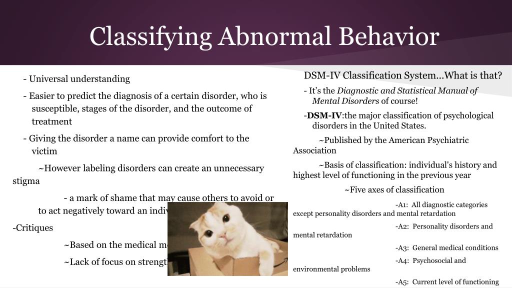 Classifying Abnormal Behavior - Universal understanding - Easier to predict the diagnosis of a certain disorder, who is susceptible, stages of the disorder, and the outcome of treatment - Giving the disorder a name can provide comfort to the victim ~However labeling disorders can create an unnecessary stigma - a mark of shame that may cause others to avoid or to act negatively toward an individual -Critiques ~Based on the medical model ~Lack of focus on strengths DSM-IV Classification System...What is that? - It’s the Diagnostic and Statistical Manual of Mental Disorders of course! -DSM-IV:the major classification of psychological disorders in the United States. ~Published by the American Psychiatric Association ~Basis of classification: individual's history and highest level of functioning in the previous year ~Five axes of classification -A1: All diagnostic categories except personality disorders and mental retardation -A2: Personality disorders and mental retardation -A3: General medical conditions -A4: Psychosocial and environmental problems -A5: Current level of functioning