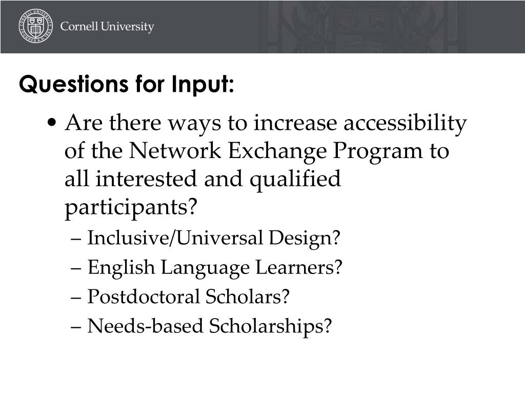 Questions for Input: • Are there ways to increase accessibility of the Network Exchange Program to all interested and qualified participants? • Inclusive/Universal Design? • English Language Learners? • Postdoctoral Scholars? • Needs-based Scholarships?