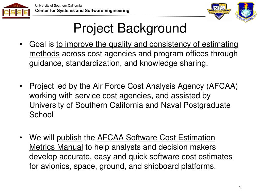 Project Background Goal is to improve the quality and consistency of estimating methods across cost agencies and program offices through guidance, standardization, and knowledge sharing. Project led by the Air Force Cost Analysis Agency (AFCAA) working with service cost agencies, and assisted by University of Southern California and Naval Postgraduate School We will publish the AFCAA Software Cost Estimation Metrics Manual to help analysts and decision makers develop accurate, easy and quick software cost estimates for avionics, space, ground, and shipboard platforms.