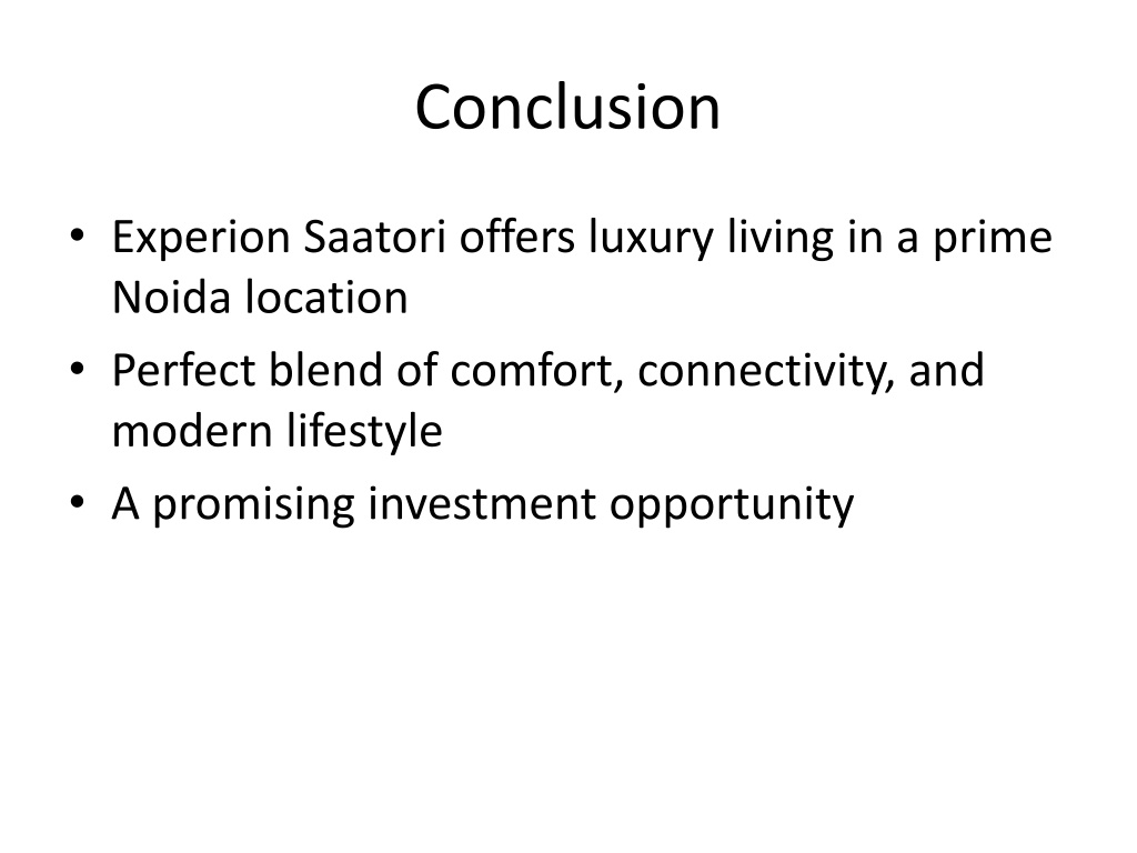 Conclusion • Experion Saatori offers luxury living in a prime Noida location • Perfect blend of comfort, connectivity, and modern lifestyle • A promising investment opportunity