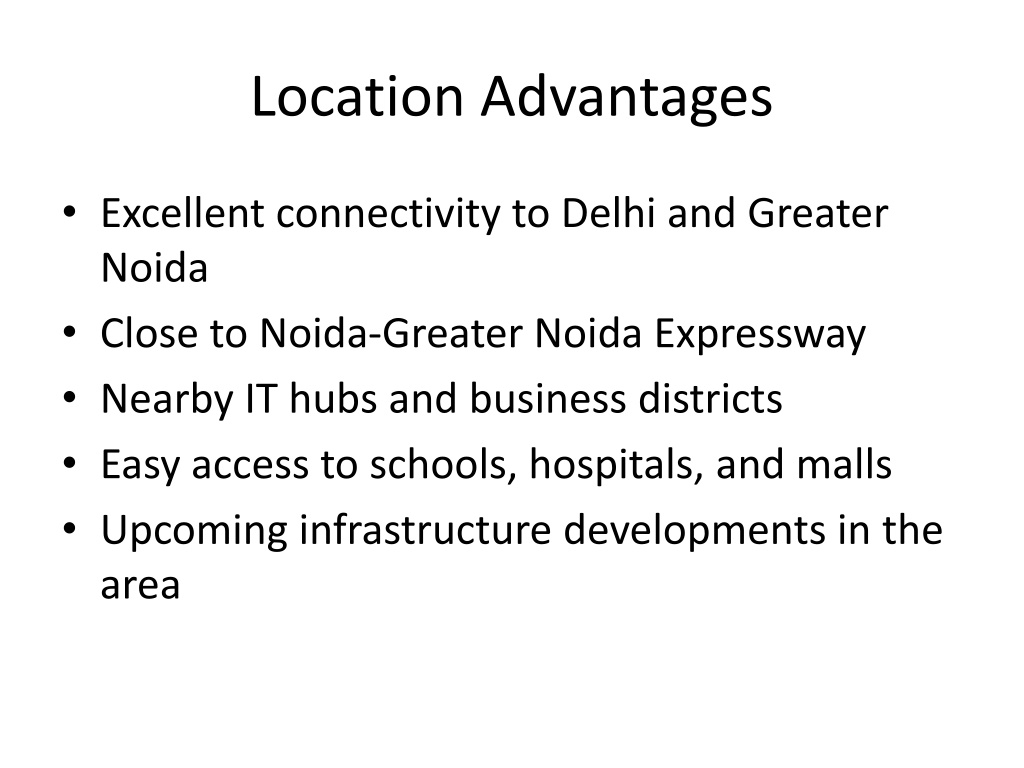 Location Advantages • Excellent connectivity to Delhi and Greater Noida • Close to Noida-Greater Noida Expressway • Nearby IT hubs and business districts • Easy access to schools, hospitals, and malls • Upcoming infrastructure developments in the area