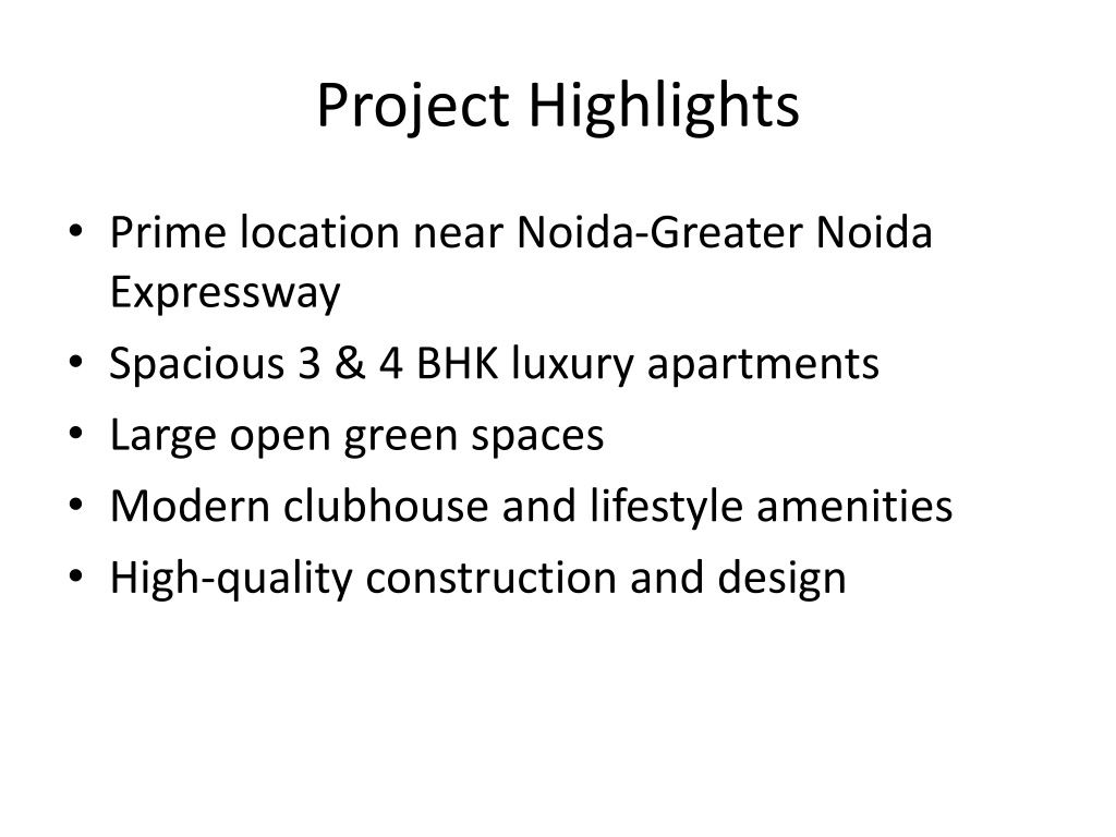 Project Highlights • Prime location near Noida-Greater Noida Expressway • Spacious 3 & 4 BHK luxury apartments • Large open green spaces • Modern clubhouse and lifestyle amenities • High-quality construction and design