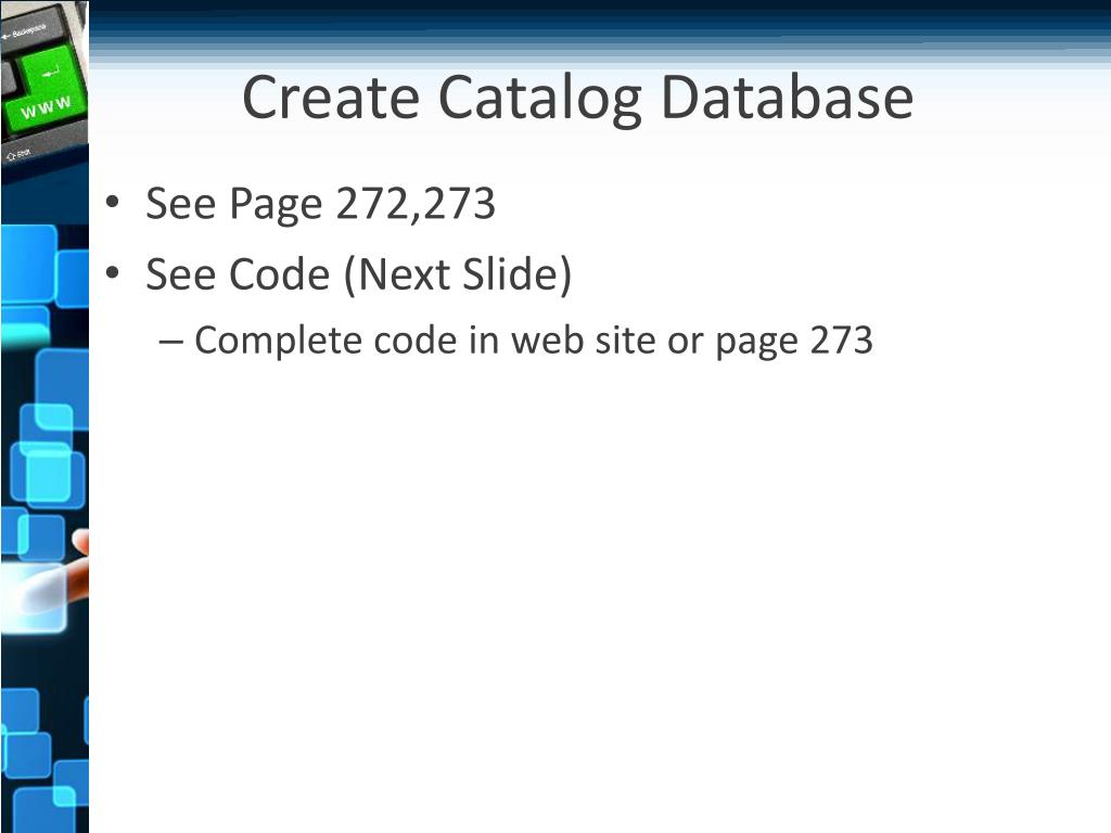 Create Catalog Database • See Page 272,273 • See Code (Next Slide) • Complete code in web site or page 273