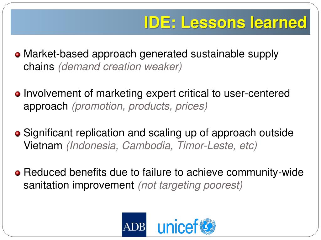 IDE: Lessons learned • Market-based approach generated sustainable supply chains (demand creation weaker) • Involvement of marketing expert critical to user-centered approach (promotion, products, prices) • Significant replication and scaling up of approach outside Vietnam (Indonesia, Cambodia, Timor-Leste, etc) • Reduced benefits due to failure to achieve community-wide sanitation improvement (not targeting poorest)