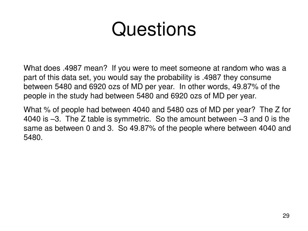Questions What does .4987 mean? If you were to meet someone at random who was a part of this data set, you would say the probability is .4987 they consume between 5480 and 6920 ozs of MD per year. In other words, 49.87% of the people in the study had between 5480 and 6920 ozs of MD per year. What % of people had between 4040 and 5480 ozs of MD per year? The Z for 4040 is –3. The Z table is symmetric. So the amount between –3 and 0 is the same as between 0 and 3. So 49.87% of the people where between 4040 and 5480.