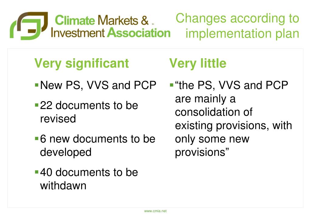 Changes according to implementation plan Very significant • New PS, VVS and PCP • 22 documents to be revised • 6 new documents to be developed • 40 documents to be withdawn Very little • “the PS, VVS and PCP are mainly a consolidation of existing provisions, with only some new provisions”