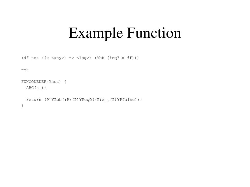Example Function (df not ((x <any>) => <log>) (%bb (%eq? x #f))) ==> FUNCODEDEF(Ynot) { ARG(x_); return (P)YPbb((P)(P)YPeqQ((P)x_,(P)YPfalse)); }