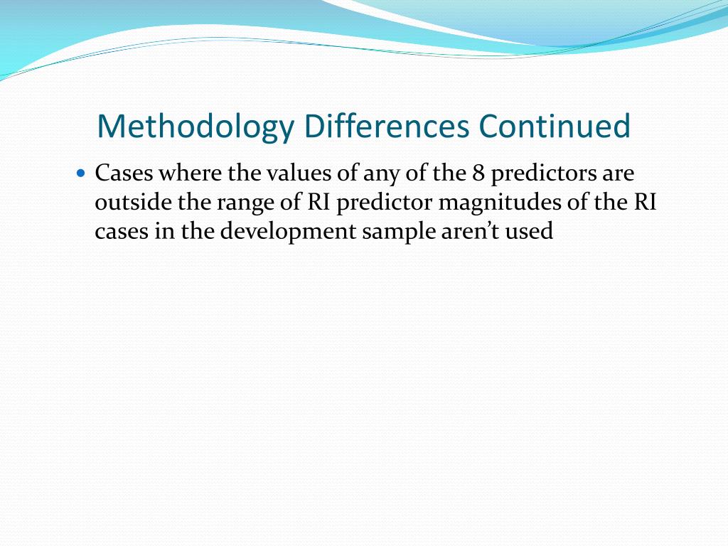 Methodology Differences Continued • Cases where the values of any of the 8 predictors are outside the range of RI predictor magnitudes of the RI cases in the development sample aren’t used