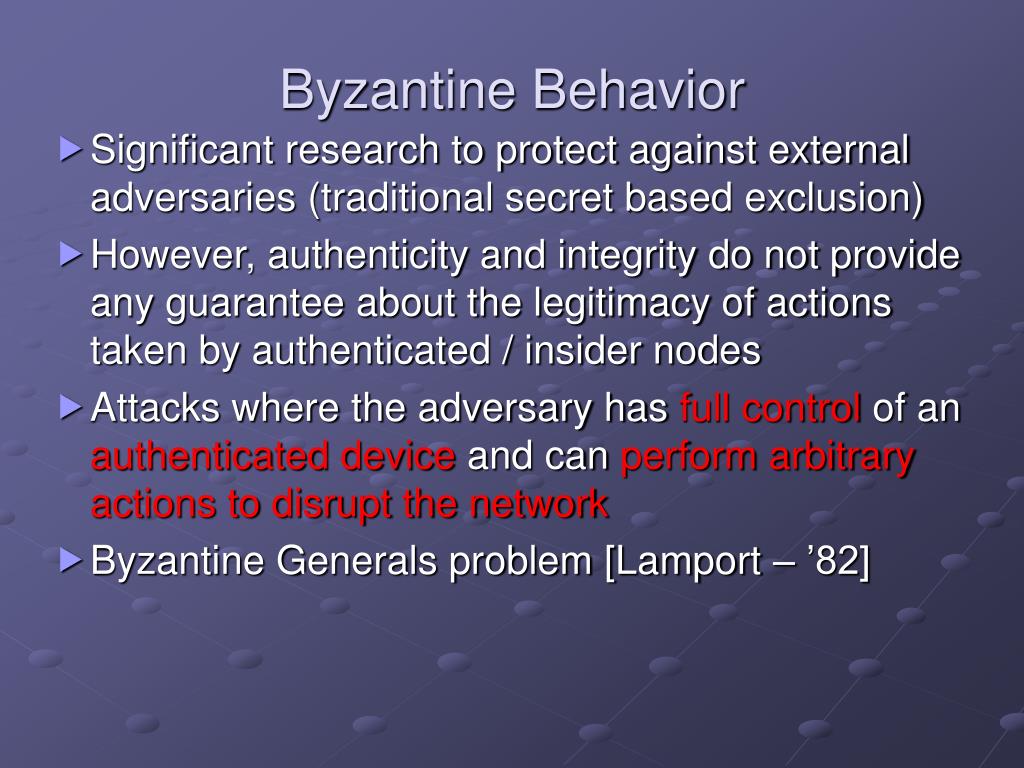 Byzantine Behavior • Significant research to protect against external adversaries (traditional secret based exclusion) • However, authenticity and integrity do not provide any guarantee about the legitimacy of actions taken by authenticated / insider nodes • Attacks where the adversary has full control of an authenticated device and can perform arbitrary actions to disrupt the network • Byzantine Generals problem [Lamport – ’82]