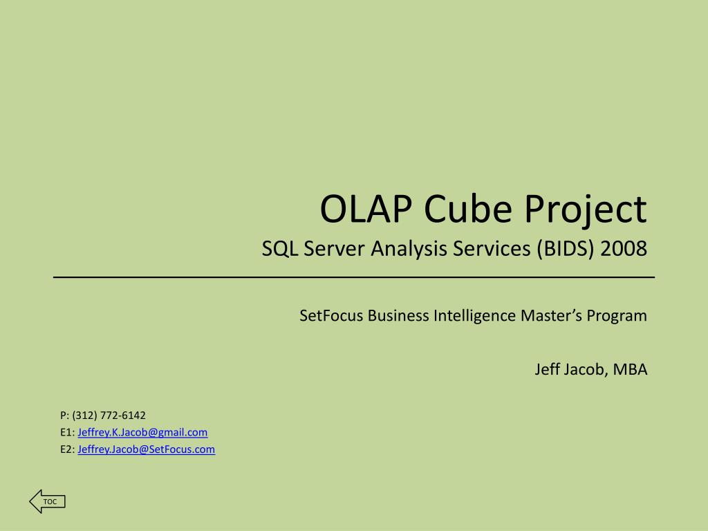 OLAP Cube ProjectSQL Server Analysis Services (BIDS) 2008 SetFocus Business Intelligence Master’s Program Jeff Jacob, MBA P: (312) 772-6142 E1: Jeffrey.K.Jacob@gmail.com E2: Jeffrey.Jacob@SetFocus.com TOC