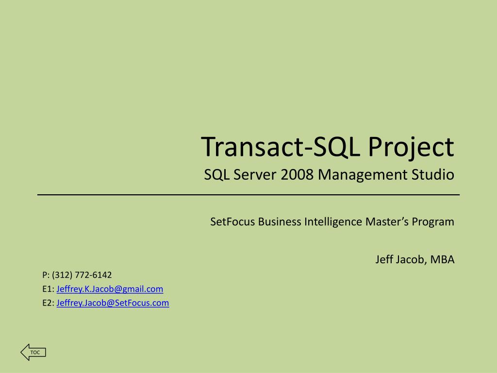 Transact-SQL ProjectSQL Server 2008 Management Studio SetFocus Business Intelligence Master’s Program Jeff Jacob, MBA P: (312) 772-6142 E1: Jeffrey.K.Jacob@gmail.com E2: Jeffrey.Jacob@SetFocus.com TOC