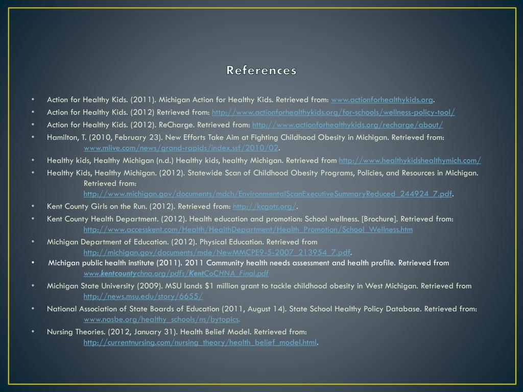 References • Action for Healthy Kids. (2011). Michigan Action for Healthy Kids. Retrieved from: www.actionforhealthykids.org. • Action for Healthy Kids. (2012) Retrieved from: http://www.actionforhealthykids.org/for-schools/wellness-policy-tool/ • Action for Healthy Kids. (2012). ReCharge. Retrieved from: http://www.actionforhealthykids.org/recharge/about/ • Hamilton, T. (2010, February 23). New Efforts Take Aim at Fighting Childhood Obesity in Michigan. Retrieved from: www.mlive.com/news/grand-rapids/index.ssf/2010/02. • Healthy kids, Healthy Michigan (n.d.) Healthy kids, healthy Michigan. Retrieved from http://www.healthykidshealthymich.com/ • Healthy Kids, Healthy Michigan. (2012). Statewide Scan of Childhood Obesity Programs, Policies, and Resources in Michigan. Retrieved from: http://www.michigan.gov/documents/mdch/EnvironmentalScanExecutiveSummaryReduced_244924_7.pdf. • Kent County Girls on the Run. (2012). Retrieved from: http://kcgotr.org/. • Kent County Health Department. (2012). Health education and promotion: School wellness. [Brochure]. Retrieved from: http://www.accesskent.com/Health/HealthDepartment/Health_Promotion/School_Wellness.htm • Michigan Department of Education. (2012). Physical Education. Retrieved from http://michigan.gov/documents/mde/NewMMCPE9-5-2007_213954_7.pdf. • Michigan public health institute (2011). 2011 Community health needs assessment and health profile. Retrieved from www.kentcountychna.org/pdfs/KentCoCHNA_Final.pdf • Michigan State University (2009). MSU lands $1 million grant to tackle childhood obesity in West Michigan. Retrieved from http://news.msu.edu/story/6655/ • National Association of State Boards of Education (2011, August 14). State School Healthy Policy Database. Retrieved from: www.nasbe.org/healthy_schools/ns/bytopics. • Nursing Theories. (2012, January 31). Health Belief Model. Retrieved from: http://currentnursing.com/nursing_theory/health_belief_model.html.