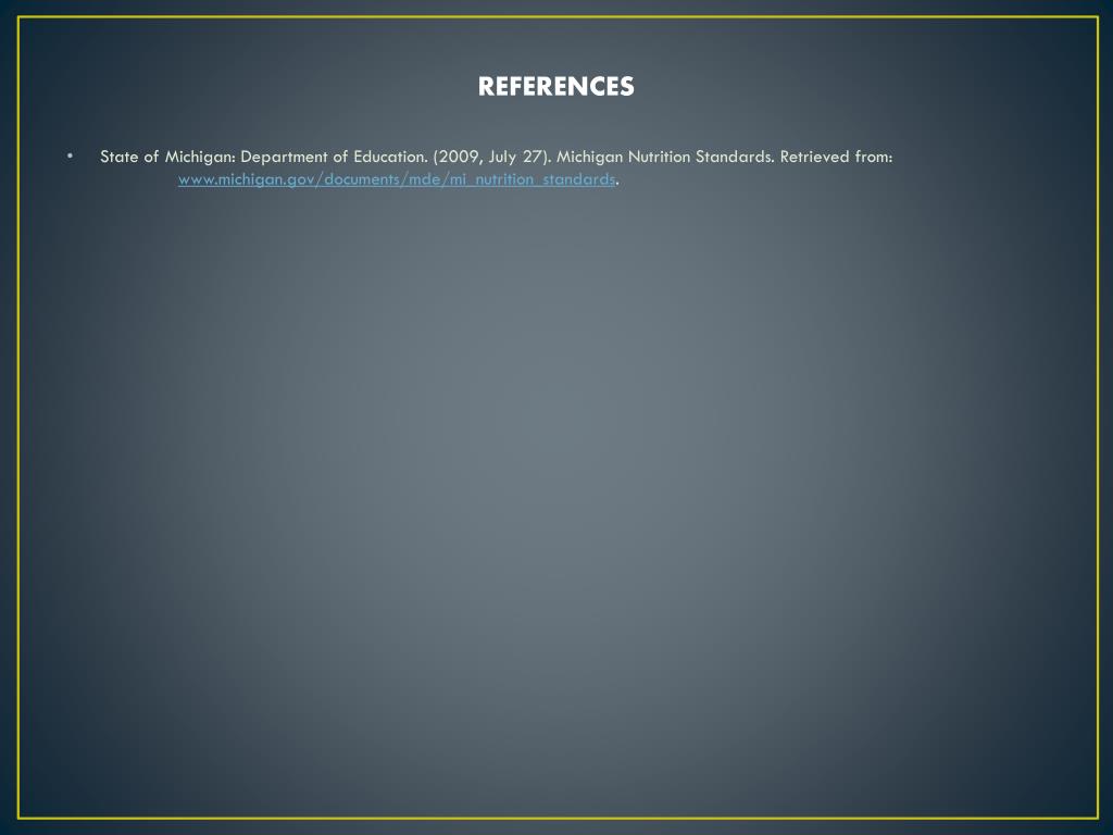 REFERENCES • State of Michigan: Department of Education. (2009, July 27). Michigan Nutrition Standards. Retrieved from: www.michigan.gov/documents/mde/mi_nutrition_standards.