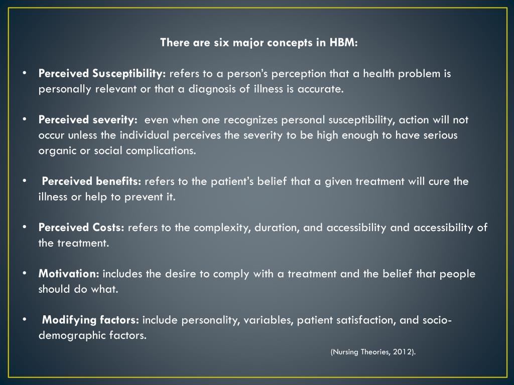 There are six major concepts in HBM: • Perceived Susceptibility: refers to a person’s perception that a health problem is personally relevant or that a diagnosis of illness is accurate. • Perceived severity: even when one recognizes personal susceptibility, action will not occur unless the individual perceives the severity to be high enough to have serious organic or social complications. • Perceived benefits: refers to the patient’s belief that a given treatment will cure the illness or help to prevent it. • Perceived Costs: refers to the complexity, duration, and accessibility and accessibility of the treatment. • Motivation: includes the desire to comply with a treatment and the belief that people should do what. • Modifying factors: include personality, variables, patient satisfaction, and socio-demographic factors. • (Nursing Theories, 2012).