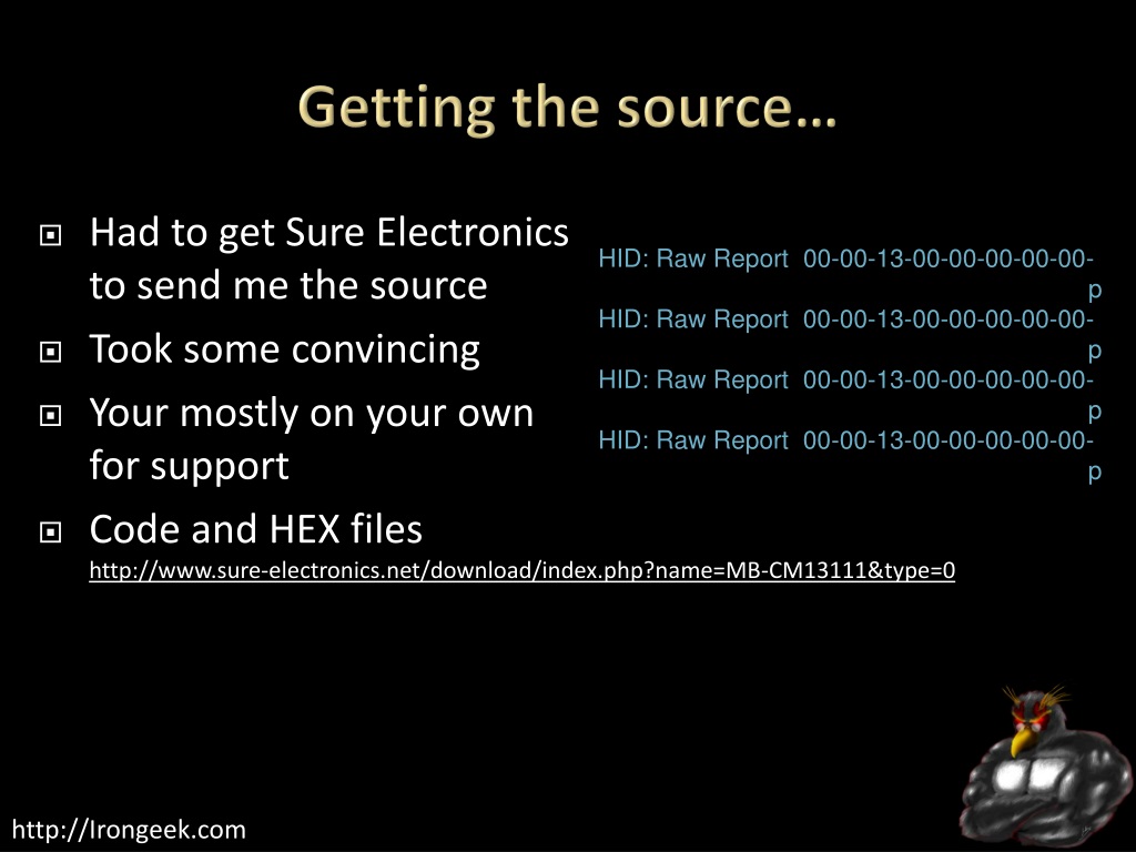 Getting the source… • Had to get Sure Electronicsto send me the source • Took some convincing • Your mostly on your own for support • Code and HEX fileshttp://www.sure-electronics.net/download/index.php?name=MB-CM13111&type=0 HID: Raw Report 00-00-13-00-00-00-00-00- p HID: Raw Report 00-00-13-00-00-00-00-00- p HID: Raw Report 00-00-13-00-00-00-00-00- p HID: Raw Report 00-00-13-00-00-00-00-00- p
