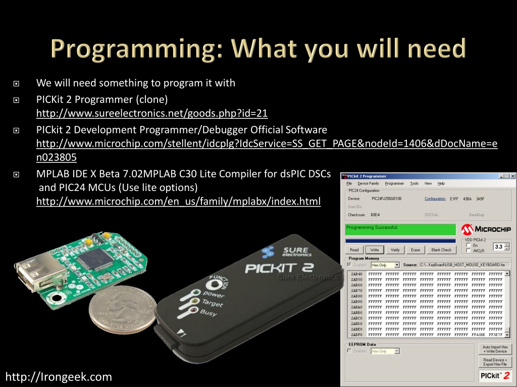 Programming: What you will need • We will need something to program it with • PICKit 2 Programmer (clone)http://www.sureelectronics.net/goods.php?id=21 • PICkit 2 Development Programmer/Debugger Official Softwarehttp://www.microchip.com/stellent/idcplg?IdcService=SS_GET_PAGE&nodeId=1406&dDocName=en023805 • MPLAB IDE X Beta 7.02MPLAB C30 Lite Compiler for dsPICDSCsand PIC24 MCUs (Use lite options)http://www.microchip.com/en_us/family/mplabx/index.html