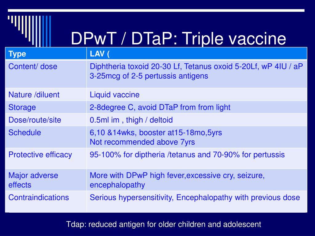 DPwT / DTaP: Triple vaccine Type LAV ( Content/ dose Diphtheria toxoid 20-30 Lf, Tetanus oxoid 5-20Lf, wP 4IU / aP 3-25mcg of 2-5 pertussis antigens Nature /diluent Liquid vaccine Storage 2-8degree C, avoid DTaP from from light Dose/route/site 0.5ml im , thigh / deltoid Schedule 6,10 &14wks, booster at15-18mo,5yrs Not recommended above 7yrs Protective efficacy 95-100% for diptheria /tetanus and 70-90% for pertussis Major adverse effects More with DPwP high fever,excessive cry, seizure, encephalopathy Contraindications Serious hypersensitivity, Encephalopathy with previous dose Tdap: reduced antigen for older children and adolescent