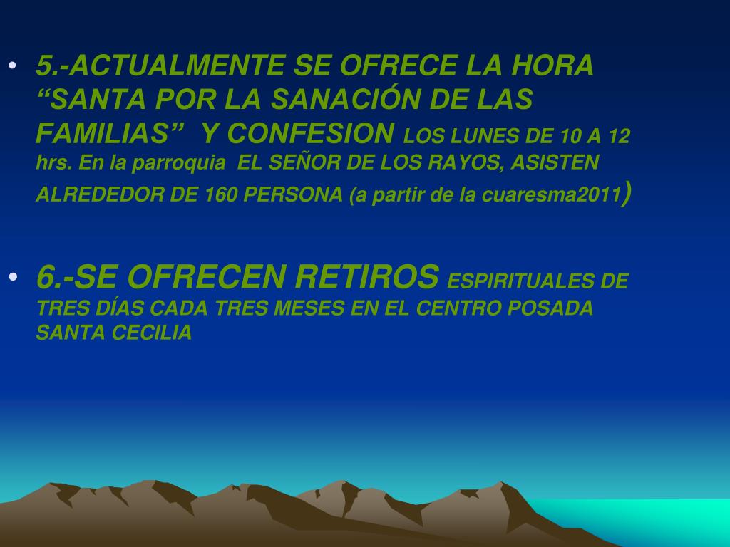5.-ACTUALMENTE SE OFRECE LA HORA “SANTA POR LA SANACIÓN DE LAS FAMILIAS” Y CONFESION LOS LUNES DE 10 A 12 hrs. En la parroquia EL SEÑOR DE LOS RAYOS, ASISTEN ALREDEDOR DE 160 PERSONA (a partir de la cuaresma2011) 6.-SE OFRECEN RETIROS ESPIRITUALES DE TRES DÍAS CADA TRES MESES EN EL CENTRO POSADA SANTA CECILIA