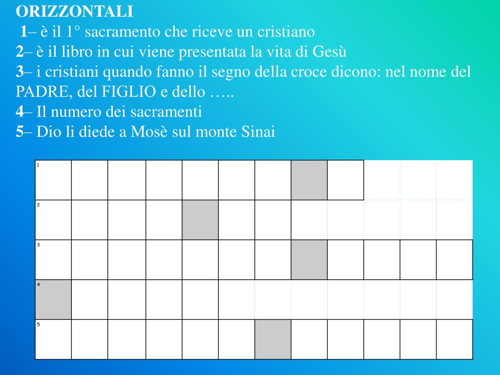 ORIZZONTALI 1– è il 1° sacramento che riceve un cristiano 2– è il libro in cui viene presentata la vita di Gesù 3– i cristiani quando fanno il segno della croce dicono: nel nome del PADRE, del FIGLIO e dello ….. 4– Il numero dei sacramenti 5– Dio li diede a Mosè sul monte Sinai