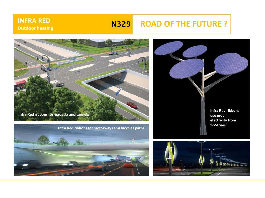 INFRA RED Outdoor heating ROAD OF THE FUTURE ? • Infra Red ribbonsuse green electricityfrom ‘PV-trees’ Infra Red ribbons for viaducts and tunnels Infra Red ribbons for motorways and bicycles paths