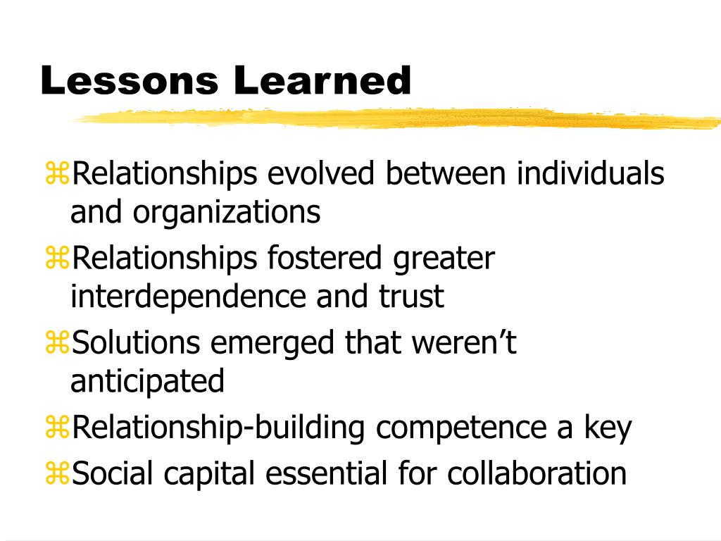 Lessons Learned • Relationships evolved between individuals and organizations • Relationships fostered greater interdependence and trust • Solutions emerged that weren’t anticipated • Relationship-building competence a key • Social capital essential for collaboration