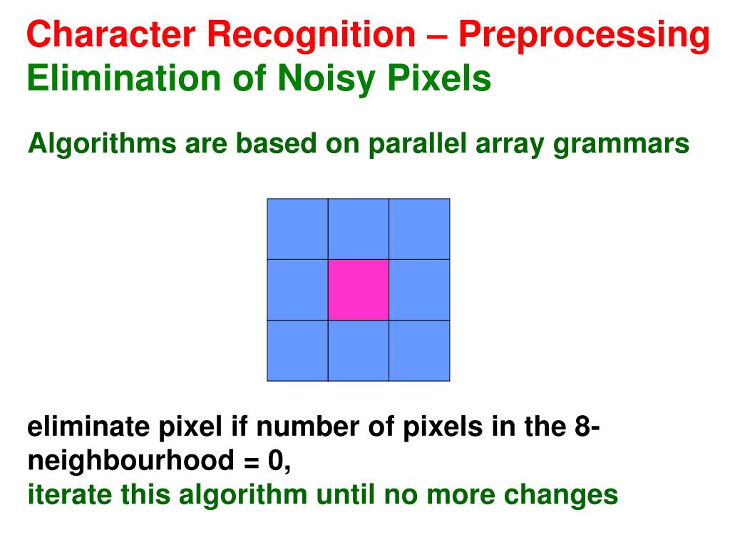 Character Recognition – PreprocessingElimination of Noisy Pixels Algorithms are based on parallel array grammars eliminate pixel if number of pixels in the 8-neighbourhood = 0, iterate this algorithm until no more changes