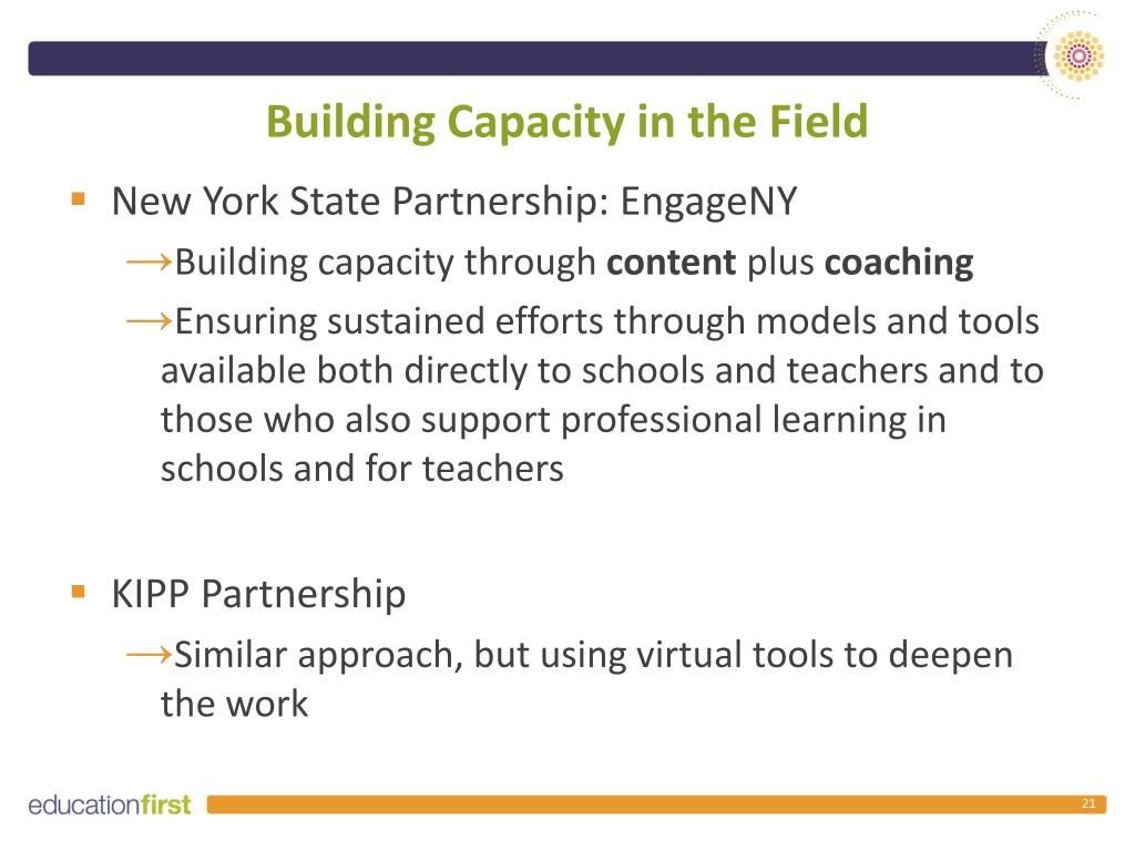 Building Capacity in the Field • New York State Partnership: EngageNY • Building capacity through content plus coaching • Ensuring sustained efforts through models and tools available both directly to schools and teachers and to those who also support professional learning in schools and for teachers • KIPP Partnership • Similar approach, but using virtual tools to deepen the work