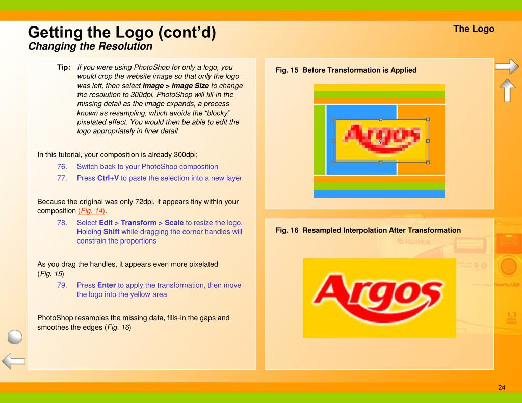 Getting the Logo (cont’d) The Logo Changing the Resolution • Tip: If you were using PhotoShop for only a logo, you would crop the website image so that only the logo was left, then select Image > Image Size to change the resolution to 300dpi. PhotoShop will fill-in the missing detail as the image expands, a process known as resampling, which avoids the “blocky” pixelated effect. You would then be able to edit the logo appropriately in finer detail • In this tutorial, your composition is already 300dpi; • Switch back to your PhotoShop composition • Press Ctrl+V to paste the selection into a new layer • Because the original was only 72dpi, it appears tiny within your composition (Fig. 14). • Select Edit > Transform > Scale to resize the logo. Holding Shift while dragging the corner handles will constrain the proportions • As you drag the handles, it appears even more pixelated (Fig. 15) • Press Enter to apply the transformation, then move the logo into the yellow area • PhotoShop resamples the missing data, fills-in the gaps and smoothes the edges (Fig. 16) Fig. 15 Before Transformation is Applied Fig. 16 Resampled Interpolation After Transformation