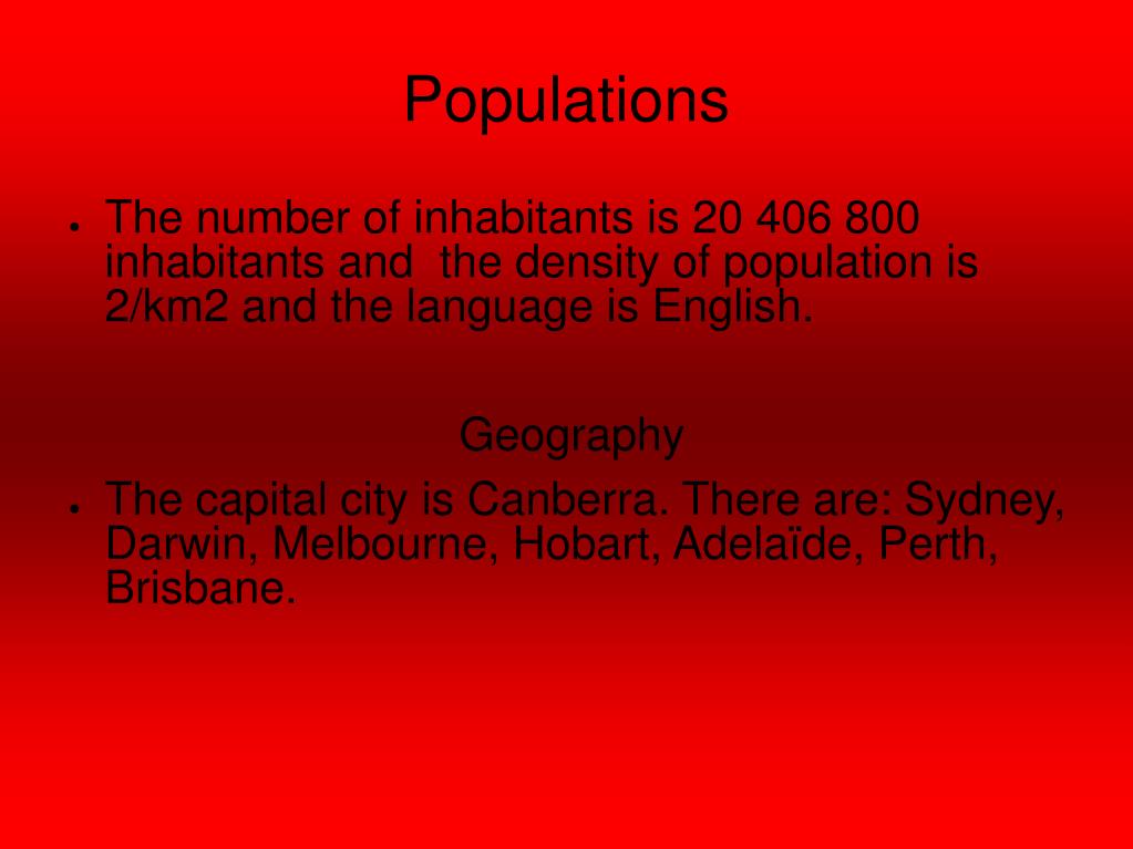 Populations • The number of inhabitants is 20 406 800 inhabitants and the density of population is 2/km2 and the language is English. Geography • The capital city is Canberra. There are: Sydney, Darwin, Melbourne, Hobart, Adelaïde, Perth, Brisbane.