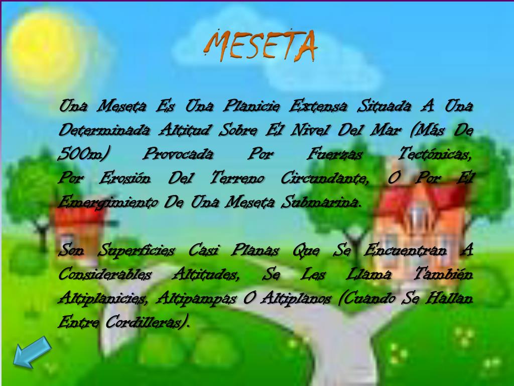 MESETA Una Meseta Es Una Planicie Extensa Situada A Una Determinada Altitud Sobre El Nivel Del Mar (Más De 500m) Provocada Por Fuerzas Tectónicas, Por Erosión Del Terreno Circundante, O Por El Emergimiento De Una Meseta Submarina. Son Superficies Casi Planas Que Se Encuentran A Considerables Altitudes, Se Les Llama También Altiplanicies, Altipampas O Altiplanos (Cuando Se Hallan Entre Cordilleras).