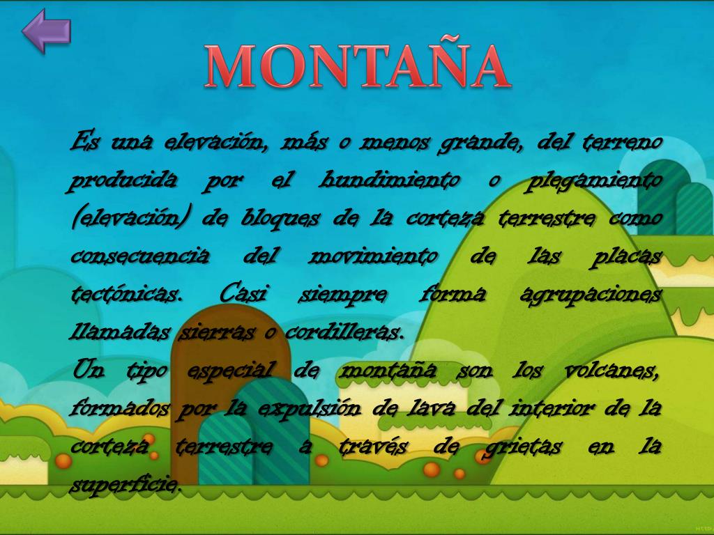 MONTAÑA Es una elevación, más o menos grande, del terreno producida por el hundimiento o plegamiento (elevación) de bloques de la corteza terrestre como consecuencia del movimiento de las placas tectónicas. Casi siempre forma agrupaciones llamadas sierras o cordilleras. Un tipo especial de montaña son los volcanes, formados por la expulsión de lava del interior de la corteza terrestre a través de grietas en la superficie.