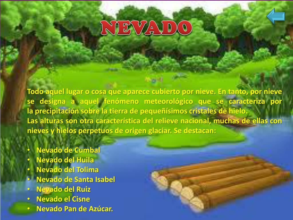 NEVADO • Todo aquel lugar o cosa que aparece cubierto por nieve. En tanto, por nieve se designa a aquel fenómeno meteorológico que se caracteriza por laprecipitaciónsobre la tierra de pequeñísimos cristales de hielo. • Las alturas son otra característica del relieve nacional, muchas de ellas con nieves y hielos perpetuos de origen glaciar. Se destacan: • Nevado de Cumbal • Nevado del Huila • Nevado del Tolima • Nevado de Santa Isabel • Nevado del Ruiz • Nevado el Cisne • Nevado Pan de Azúcar.