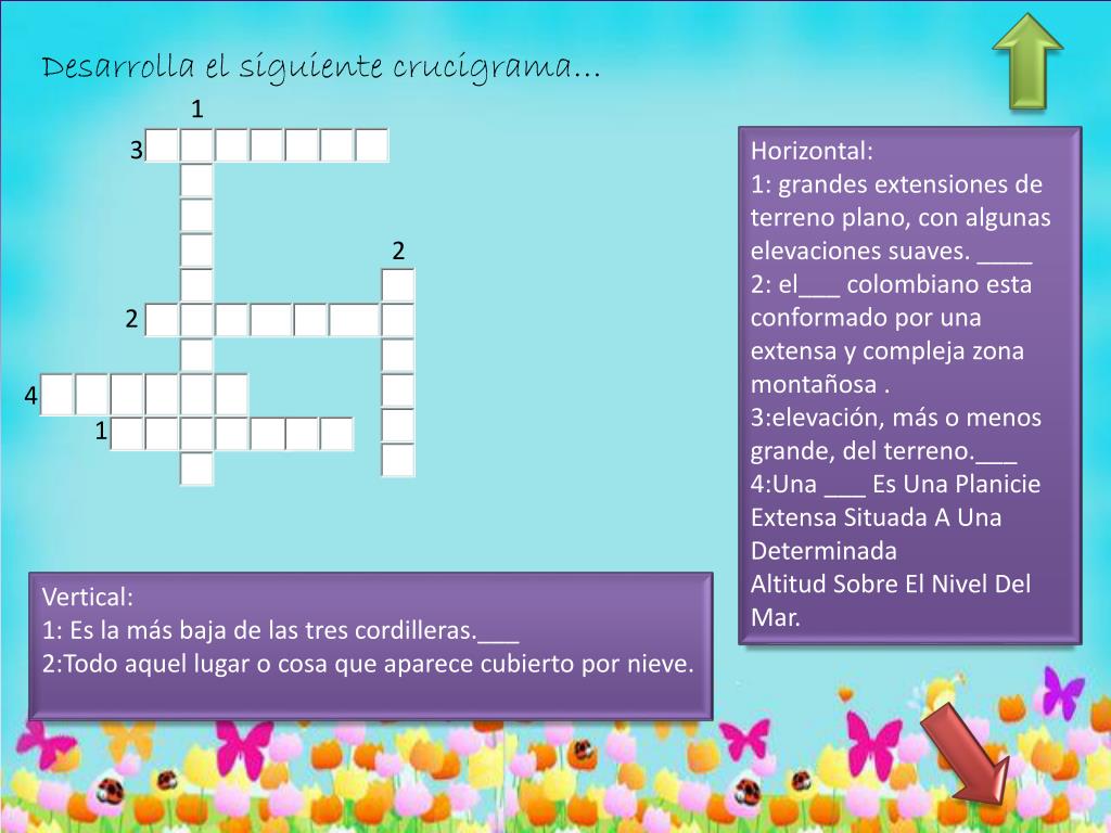 Desarrolla el siguiente crucigrama… 1 3 Horizontal: 1: grandes extensiones de terreno plano, con algunas elevaciones suaves. ____ 2: el___ colombiano esta conformado por una extensa y compleja zona montañosa . 3:elevación, más o menos grande, del terreno.___ 4:Una ___ Es Una Planicie Extensa Situada A Una Determinada Altitud Sobre El Nivel Del Mar. 2 2 4 1 Vertical: 1: Es la más baja de las tres cordilleras.___ 2:Todo aquel lugar o cosa que aparece cubierto por nieve.