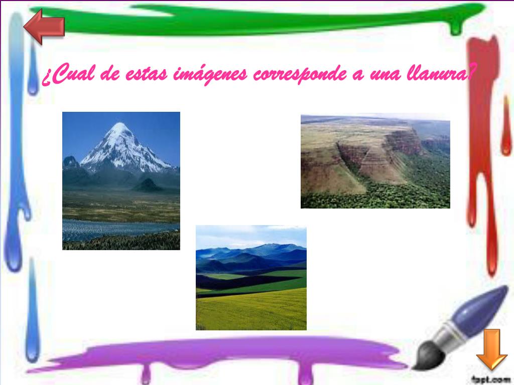 LLANURA Las llanuras son grandes extensiones de terreno plano, con algunas elevaciones suaves. Entre unos lugares y otros no hay grandes diferencias de alturas. Las pequeñas elevaciones que aparecen pueden ser colinas, lomas u oteros. A lo largo de un paisaje de llanura podemos encontrar mesetas y depresiones.